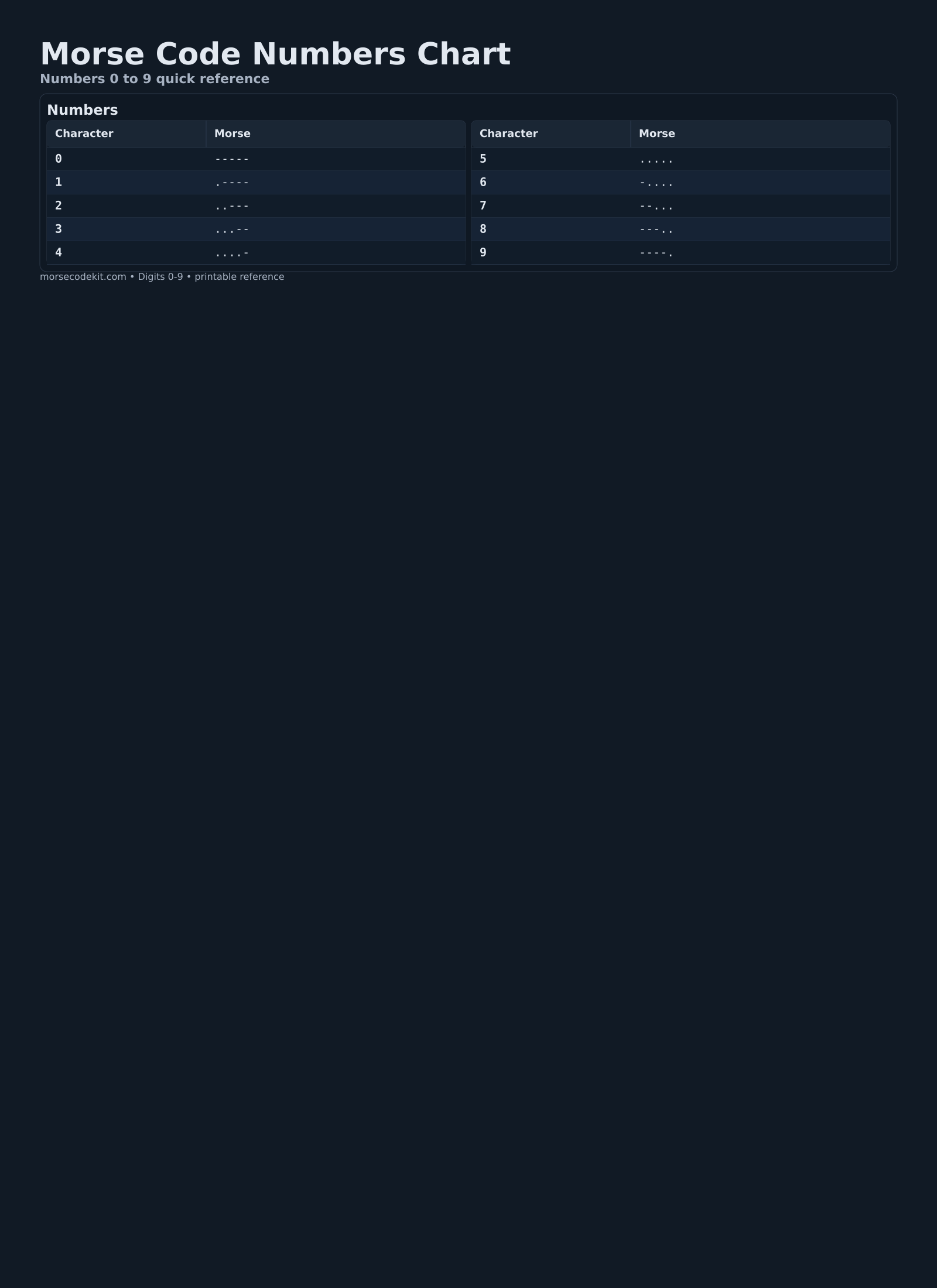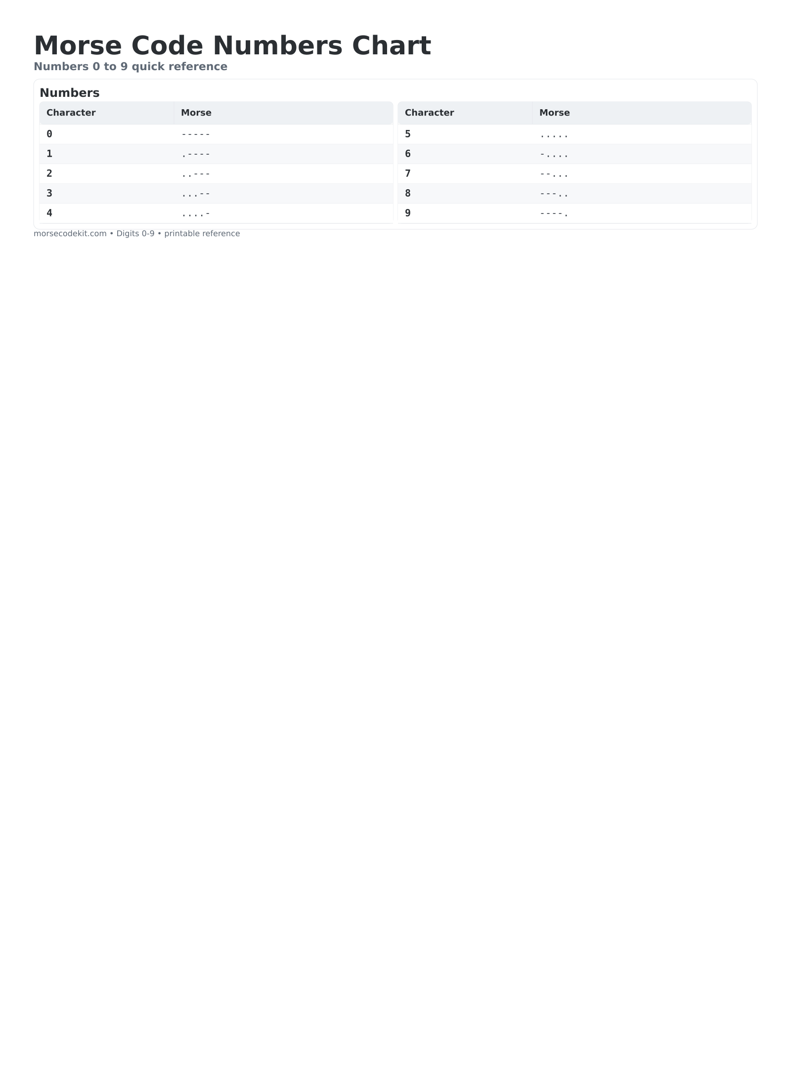 Looking for Morse code numbers 0-9? Use this number chart for fast lookup, printable output, and detail-page verification.